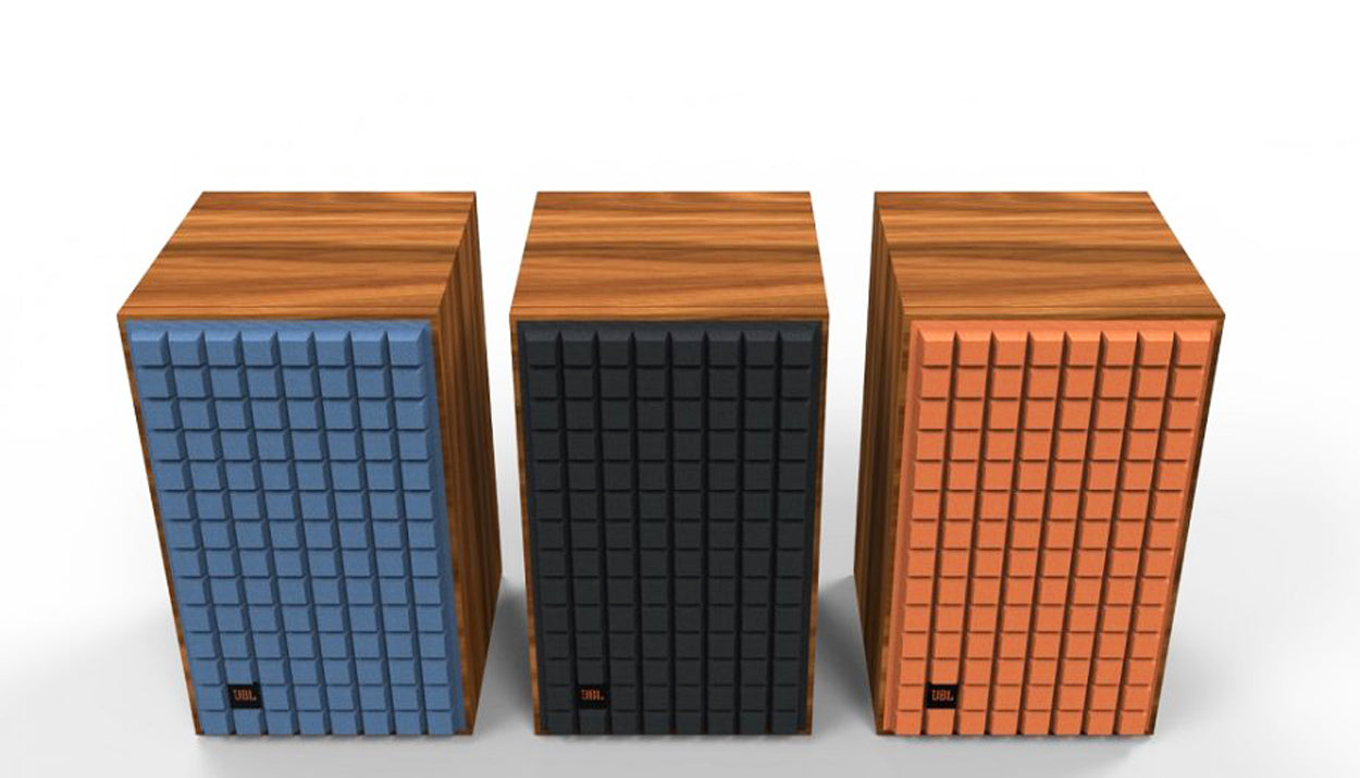 The vintage design of the JBL L82 Classic features a genuine walnut satin wood veneer cabinet and a striking Quadrex foam grille available in a choice of black, orange or blue.