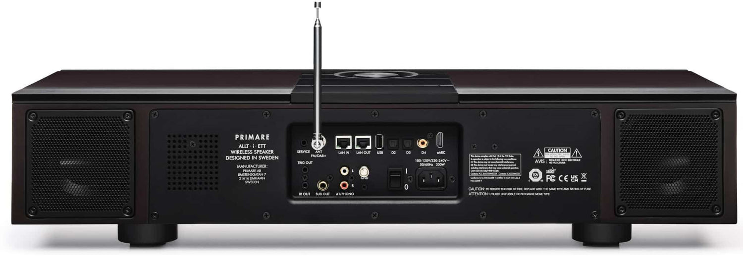 The system is equipped with FM and DAB+ radio tuners, plus wired and wireless headphone outputs. A subwoofer output is included, positioning Allt-i-Ett as an intriguing alternative to a conventional soundbar in home cinema or media room installations.